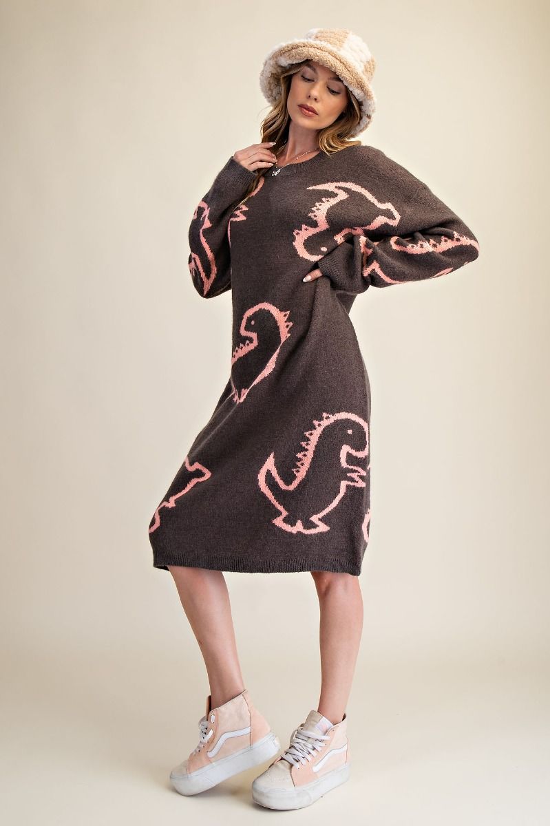DINOSAUR PATTERN KNIT MIDI SWEATER DRESS